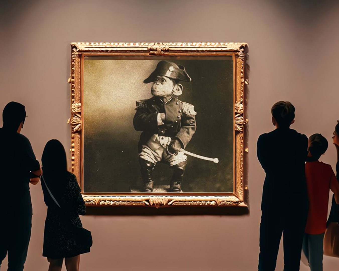 Investigando un poco en Internet descubrí que puede tener varios orígenes, entre ellos se conoce como “Little NAP – El chimpancé napoleónico del mundo” una atracción de circo más o menos por el año 1915. Otro origen puede ser la historia de “The Hartlepool Monkey” que es parte de un cuento folclórico de Hartlepool Inglaterra, donde un chimpancé fue ahorcado durante las guerras napoleónicas. Pero no puedo decir verídicamente de donde salió esta imagen, solo que disfruto de este hermoso retrato así que les dejo la chamba de investigarlo…